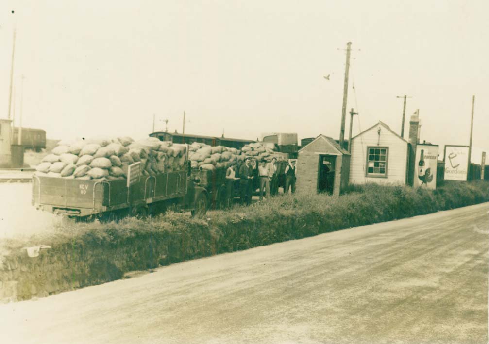 Description: Three trailer loads of potatoes in sacks adjacent at the goods yard at Long Rock. Four men pose in front of the crop. This yard was hugely important in the export of fresh produce from West Cornwall to the markets from about 1880 to 1950. Other Penhaul photographs show potatoes being harvested at nearby Pleming prior to bagging and transportation. A little earth around the potatoes acted as a preservative.