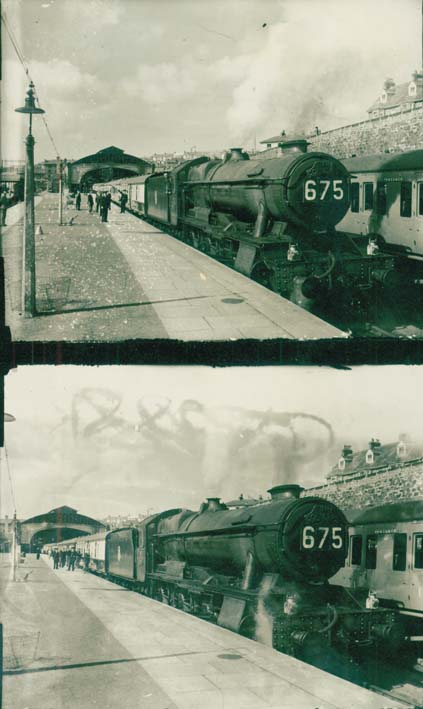 Description: Two photographs of steam loco 675 departing from Platform 1 at Penzance Railway Station one morning. It has a double blast exhaust pipe; the guard is waving his flag; the name plate is flat; the two lamps at the front indicate that it is an express passenger train; it is an engine county class with no rear destination board. The gas works on are the left.