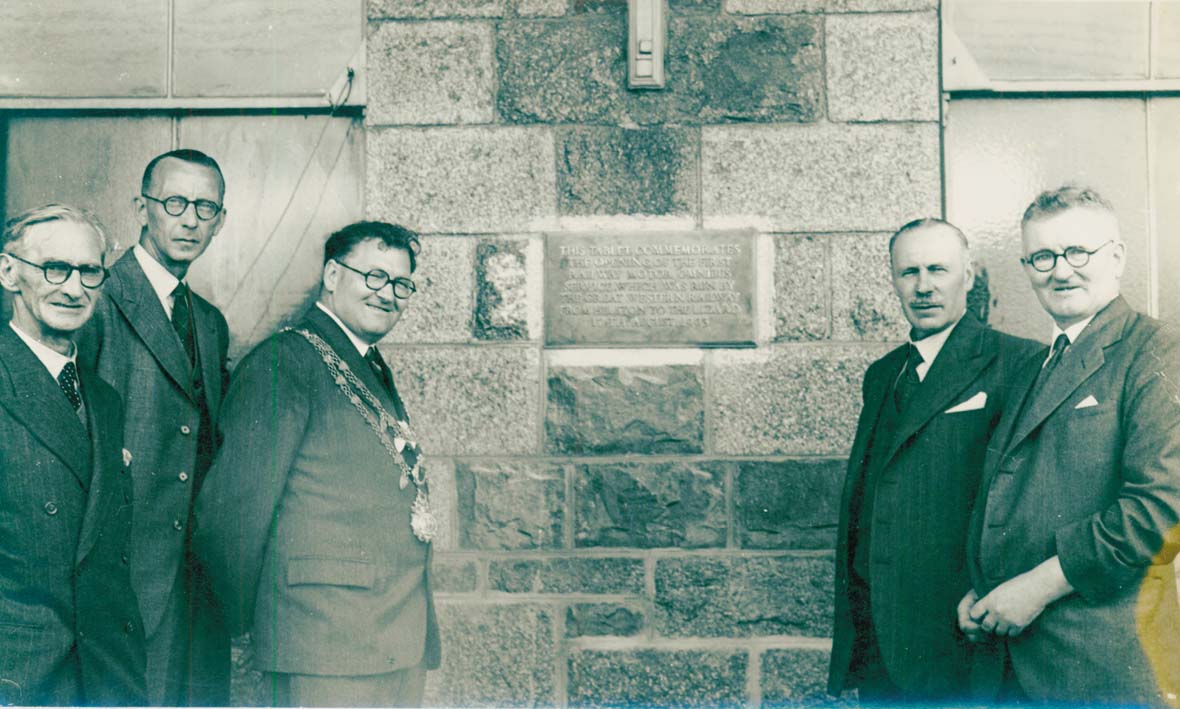 Description: At Helston Station on 17 August 1953, this is the unveiling of the plaque for the 50th anniversary of the first G.W.R Bus Service from Helston to the Lizard with Mayor of Helston, Joseph Alfred Strike Pascoe. This station was the terminus of the Helston railway from Gwinear through Nancegollan to Helston. It was proposed extending the line to the Lizard and the bus service was put in place to test its viability. The buses carried 22 passengers and it is estimated that they saved the £85,000 cost of building a railway. Great Western Railway took over the line before it was nationalised and closed in the 1960s under the Beeching Act. The tablet reads, “This tablet commemorates the opening of the first railway motor omnibus service which was run by the Great Western Railway from Helston to The Lizard 17th August 1903”