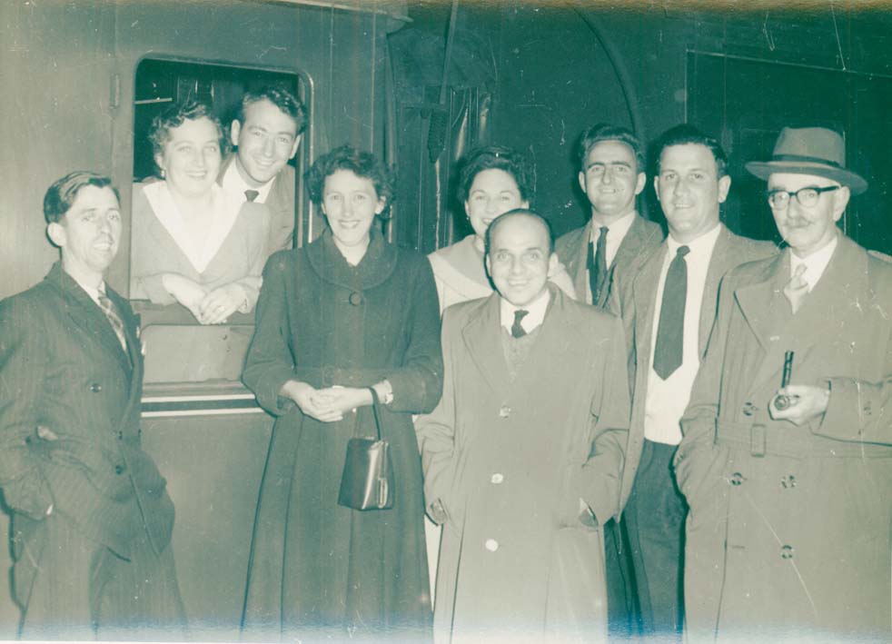 Description: A group of 7 smartly dressed people gather to say goodbye to a smiling couple at the open train window. Sixth from left is 'Darky' Barr, the Causewayhead barber and on the right is Mr W T Hitchens, headmaster of Lescudjack School.