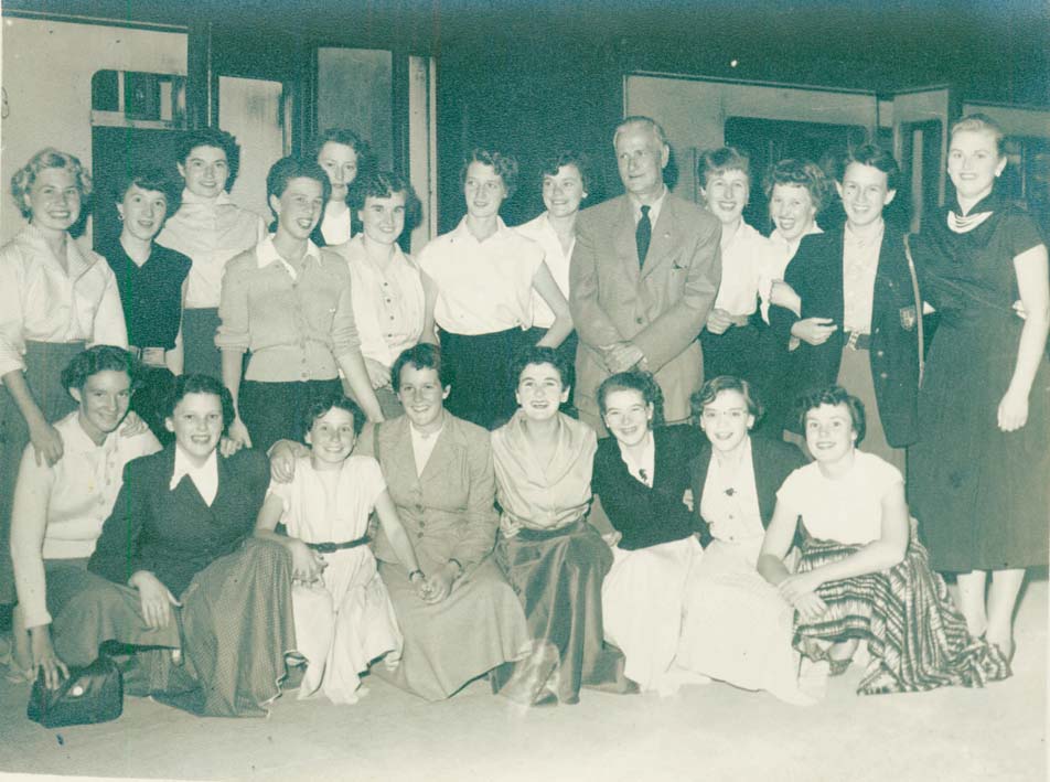 Description: Mr Farrar, the Musical Director, pictured with the Penzance Girls' Choir at Penzance Railway Station as they embark on a trip to Austria. Shirley Richards is in the back row at the far left of the photograph and Margaret Pascoe (nee Matthews) is front row, far left.