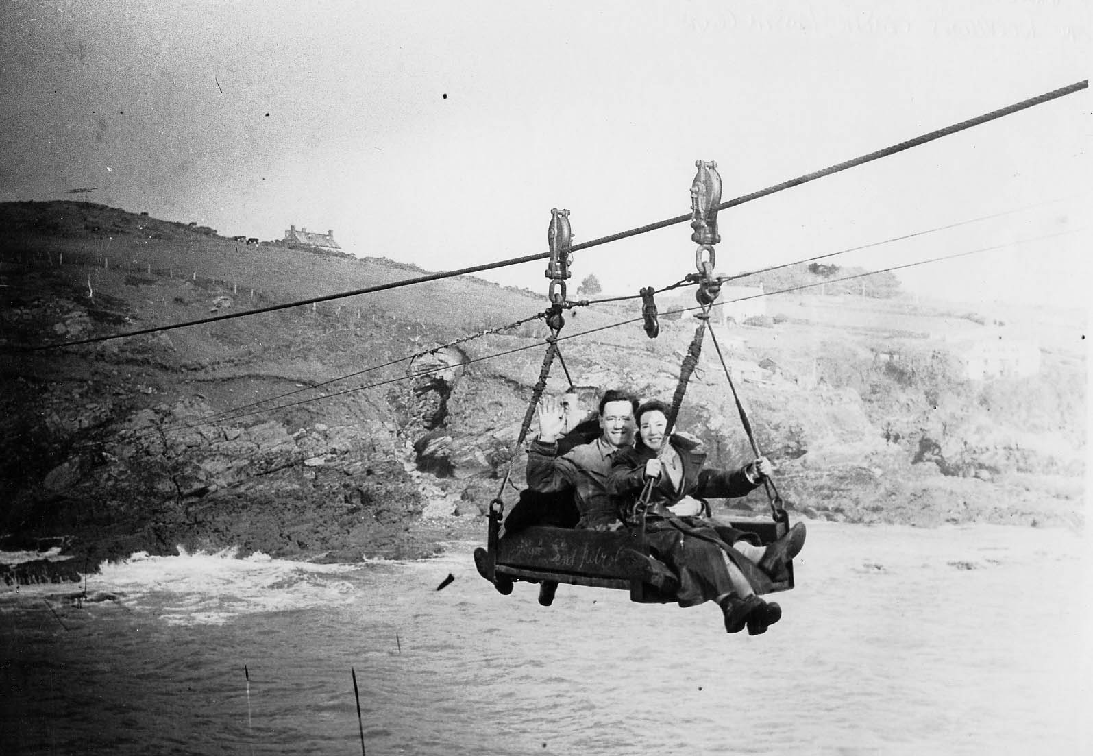 Description: This is the workmen's cradle from Prussia Cove to HMS Warspite. The couple in it look more like sightseers than workmen and have yet to be identified. HMS Warspite broke away from the salvage tow taking her to a breaker's yard. After running aground at Prussia Cove on 23 April 1947, she was refloated on the next day's tide.
