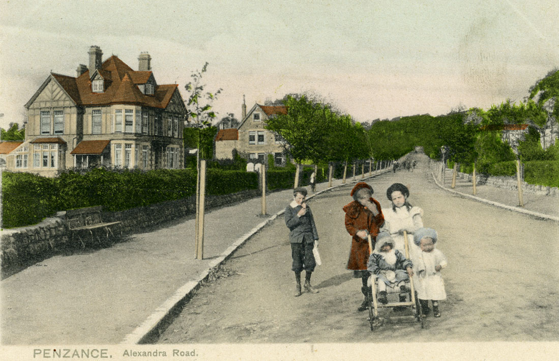 Description: Image depicting 3 children, 1 toddler and baby in pram, walking at the bottom of Alexandra Road, c.1910