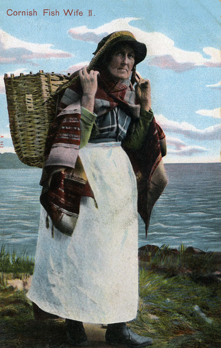 Description: This is a postcard of a Cornish Fish wife walking with her basket on her back which is attached by a strap to her forehead. She has a Paisley shawl and white apron. On the reverse is printed, '"Peacock" Series'