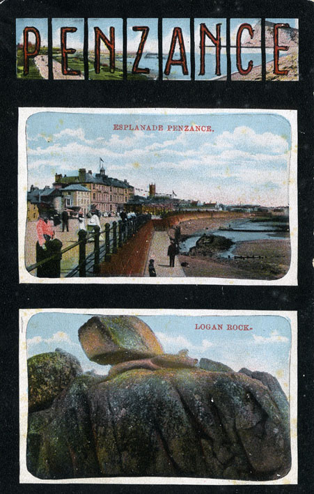Description: Across the top of this card is what appears to be a view of Newquay cut into eight with the letters of Penzance in each section. Beneath is a view of Penzance Promenade looking up from the esplanade above the beach near Lariggan. Beneath that is a shot of almost all of Logan Rock which, from the lack of vegetation and stone around it , must have taken decades to recover from its restoration in 1824. The pictures offer the choice of conventional seaside holidays or one with archaeological significance. To the 21st century eye, the pictures appear to be poorly tinted