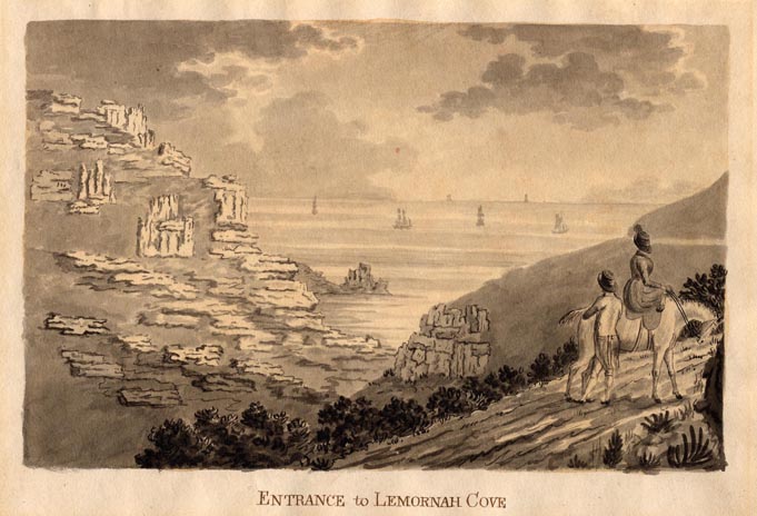 Description: View over Lamorna Cove towards the sea; two figures and horse in right-hand foreground, cove in the centre and boats at sea in the background.