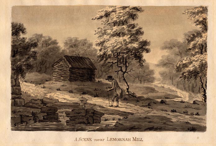 Description: Man with walking stick crossing stone bridge in foreground; stream running from back right to front left; building to the left.