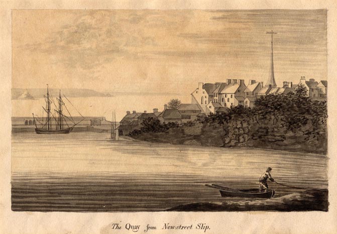 Description: Harbour view; man in rowing boat in the foreground, houses and quay in the middleground.