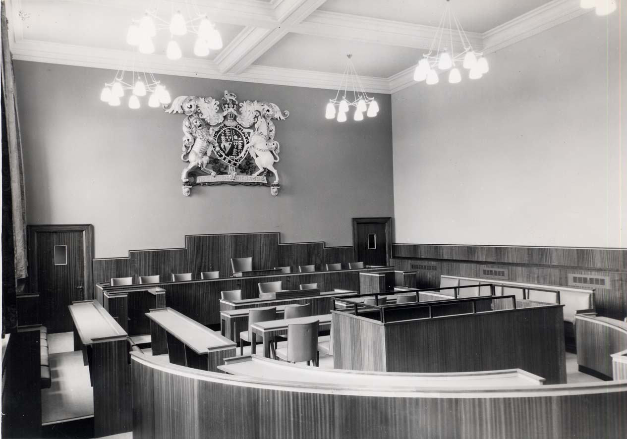 Description: This is Penzance Council chambers, the Guildhall, in St Johns Hall Penzance, after refurbishment. The old furniture was sold to a television company to be used in the 'Crown Court' series.