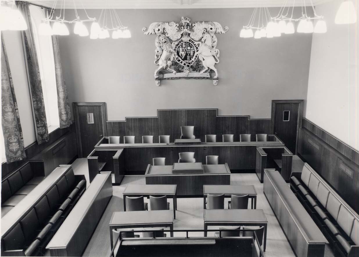 Description: Penzance Council Chambers in St Johns Hall Penzance prior to refurbishment. There are many photographs of this room in the Museum’s records. The coat of arms, ‘Honi Soit qui Mal y Pense’ is from the Isles of Scilly. The court room fittings were sold to a television company which used them for the series, 'Crown Court' in the 1970s