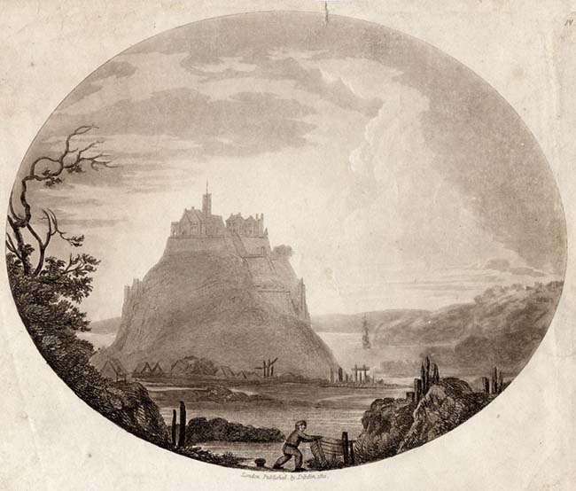 Description: Stylised view of the Mount, shown as being much closer to the mainland that it really is. There are small huts around base of Mount; a galleon in the background; a man with a rowing boat on the foreshore. Image set within an oval. Published by Dibdin.