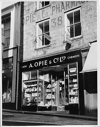Description: This photograph shows the shop frontage of A Opie and Co Ltd., Market Jew Street, Penzance. By 1911 Opie's was making and marketing Mounts Bay Bouquet perfume selling at 2s 6d, 4s 9d and 7s 9d a bottle. The business is listed on Page 50 of Rodda's Almanack 1913. By 1926 Homeland Handbook lists other branches, also Keen;s Pharmacy, Bray's Pharmacy in Fore Street Redruth and the Drug Store on the Strand in Newlyn.