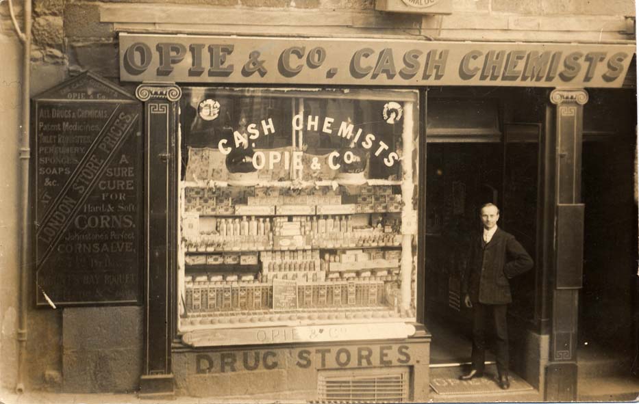 Description: A Opie and Co Ltd. shop front, Market Jew Street, Penzance. Mr J Opie standing in doorway