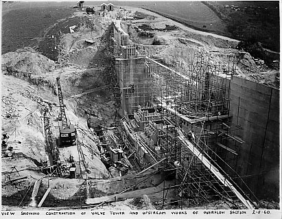 Description: Drift reservoir. View showing construction of valve tower and upstream works of overflow section