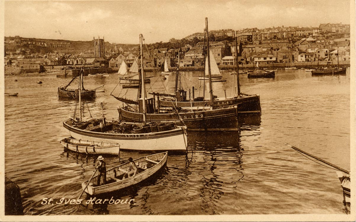 Item: A 1927 view over St Ives Harbour with a man skulling a skiff in the foreground