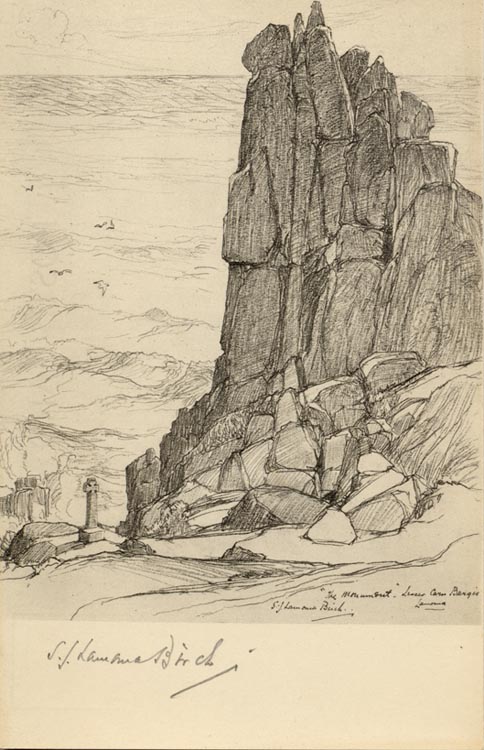 Description: Postcard of a sketch of Carn Barges, drawn by S J Lamorna Birch. Written in pencil on front - 'The Monument, Lesser Carn Barges, Lamorna' and signed 'S J Lamorna Birch'.