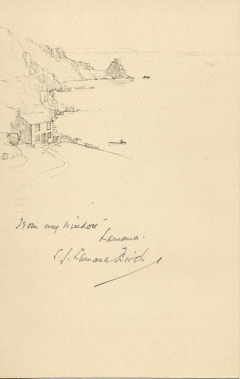 Description: Postcard of a sketch of Lamorna, as seen from the artist's window, drawn by S J Lamorna Birch. Written in pencil on front - 'From my window, Lamorna' and signed 'S J Lamorna Birch'.
