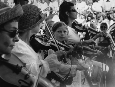 Item: Four female violinists, part of the Golowan Band, playing in a procession