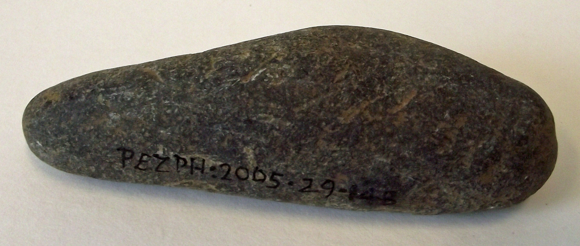 Description: A rolled elongated pebble possibly used as a tool for example a hammer stone.