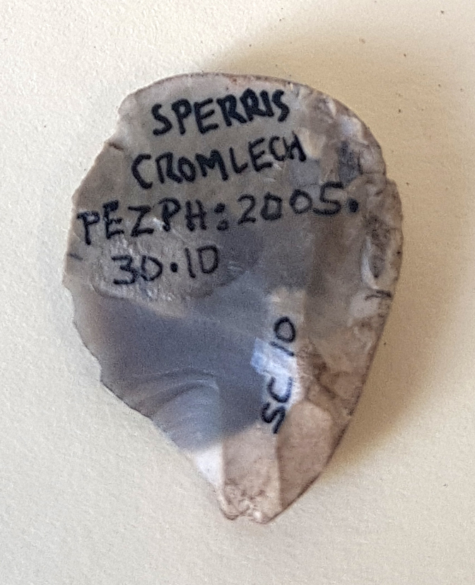 Description: A flint flake, found in dark earth and stones, which may have been used as a scraper.