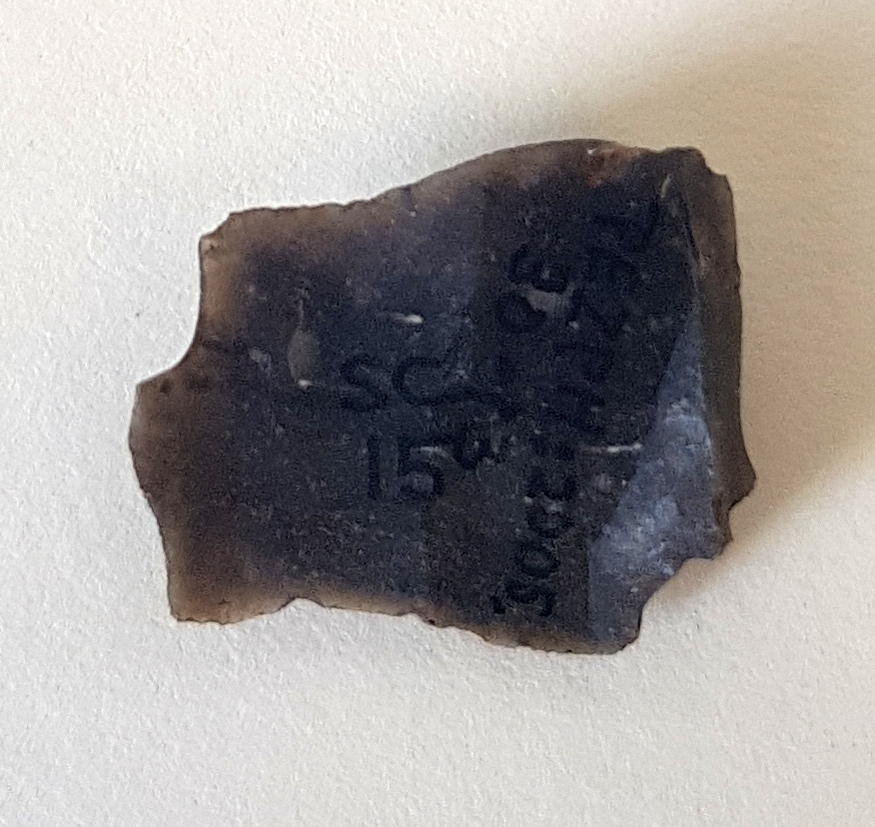 Description: A flint flake found in grey clay above rab.