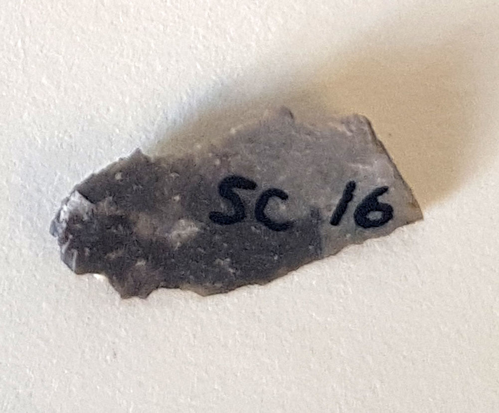 Description: A flint flake found in grey clay above rab.