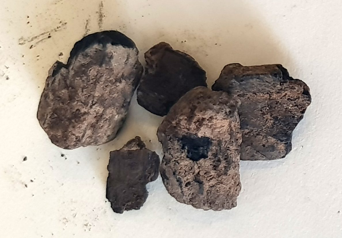 Description: Four charcoal pieces found in light brown gravelly soil.