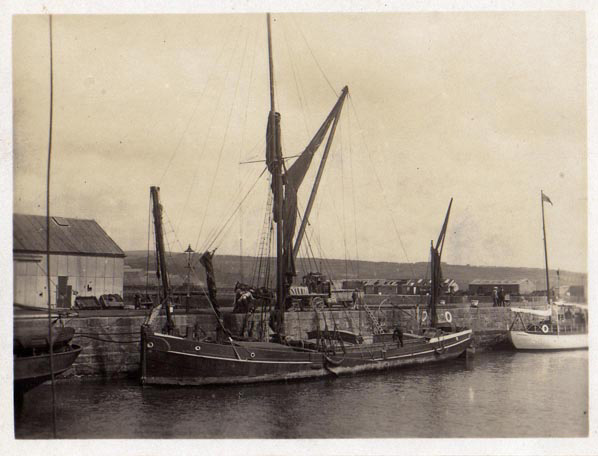 Description: A photograph of a Thames barge, unloading in the floating dock of Penzance harbour. To the right can be seen the fish market building. These barges were highly efficient, requiring as few as 2 crew, and were part of the massive trade by wind powered coasters up to the Second World War.