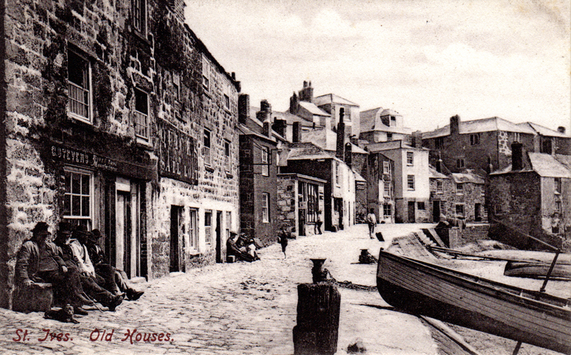 Description: Frith postcard showing a view of old houses at the Wharf, St Ives. In the foreground can be seen the premises of 'C. Stevens boot manufacturer' and Quick's sail loft. There are people sitting on benches outside the houses.
