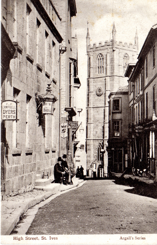 Description: Postcard showing High Street, St Ives. Signs for the Queen's Hotel; P and P Campbell Dyers Perth; and Pratt's Motor Spirit can be seen to the left and Pray's Watchmaker to the right. St Ia Church is in the background.