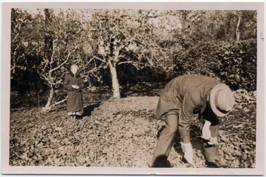 Description: Photograph of Isabel and Alfred Branwell picking violets at the botton of the garden at Penlee House. Son and daughter-in-law of JR Branwell, who lived at Penlee House. Printed on 'Magna Print Will R. Rose' photographic paper.