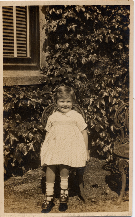 Description: Photograph of Elizabeth Hancock, sitting outside Penlee House. Elizabeth was the great-grandchild of JR Branwell, who lived at Penlee House and daughter of Vera Branwell. Written on pencil on the reverse side is a possible dating of 1928.
