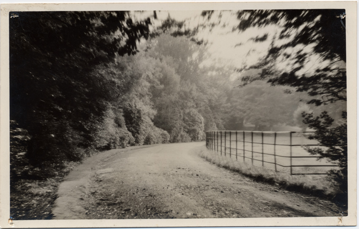 Description: Photographic postcard of the drive towards Penlee House. A black metal fence follows the drive on the right. Lawn to the right with trees and shrubs on the left.