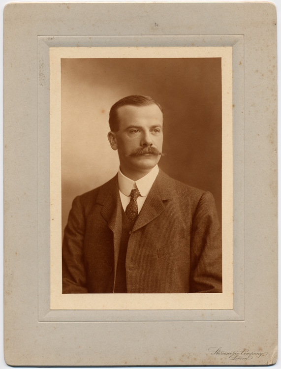 Description: A sepia cabinet card of Alfred Branwell, son of JR Branwell, who lived at Penlee House. He wears a suit and spotted tie. 'Stereographic Company London' is printed in the bottom left-hand corner. Written on the back is the suggested date of 1910 followed with a question mark. The details of the photographer are also advertised on the back in a decorative form - The London Stereographic Company Photographers to Her Majesty 106 Regent Street, W. and 54, Cheapside, E.C' with an emblem.