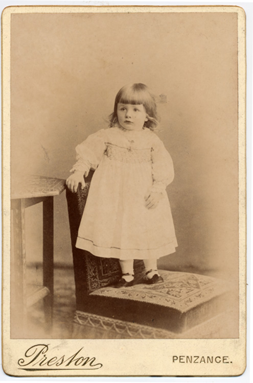 Description: A cabinet card of a young Edward Branwell, grandchild of JR Branwell, who lived at Penlee House. He stands on an embroidered wooden chair wearing a decorative white dress. The Preston logo is in the bottom left-hand corner and Penzance written in capitals to the bottom right. The cabinet card is within a tissue cover, which is torn in places.