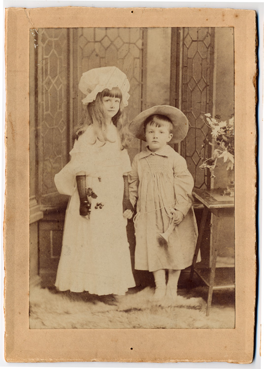 Description: A mounted photograph of Vera and Edward Branwell. grandchildren of JR Branwell, who lived at Penlee House. She wears a white dress with long black gloves and white hat. He wears the same wide brimmed hat and smock as in the other Preston photographs PEZPH : 2006.33.44-45, holding a hunting horn. On the reverse side is a written suggested date of 1904. Most likely a Preston photograph as it was taken at the same time as PEZPH : 2006.33.47, which is clearly photographed by Preston, Penzance.
