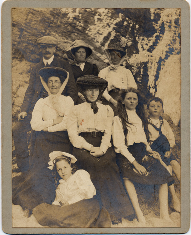 Description: A photograph of the Branwell family at Porthcurno beach, on a picnic outing. On the back line is (left to right) Alfred Branwell (son of JR Branwell) Edith Gage and Beatrice Gage (first cousins of Isabel Branwell once removed, nicknamed 'E' and 'B'. Their father's mother was Elizabeth, nee Tregurtha, Annie Dennis's sister.) Seated is the Governess, Miss Griffith ('Diffy'), Isabel, Vera and Edward Branwell, daughter-in-law and grandchildren of JR Branwell, who lived at Penlee House. In front sits an unidentified child, who is not Sybil Branwell.