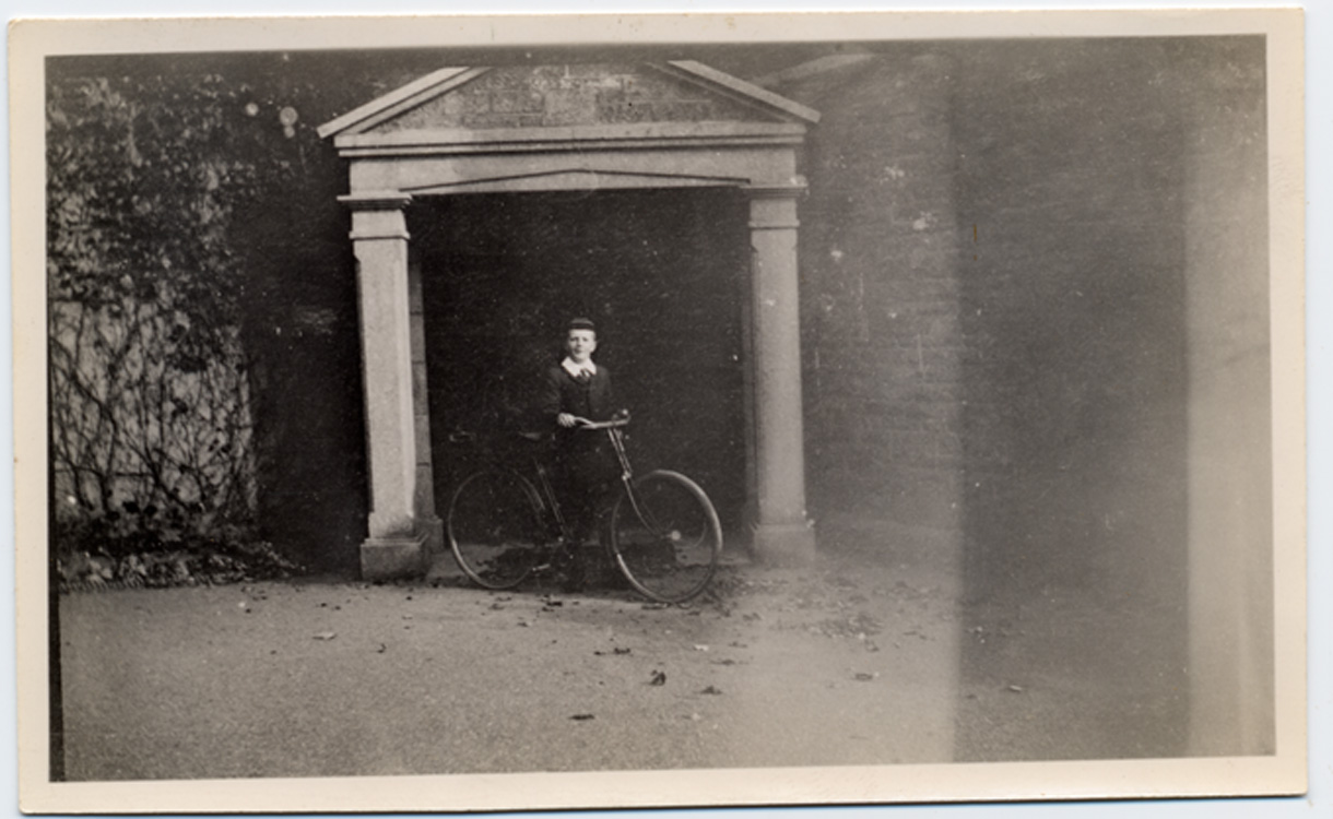 Description: Edward Branwell, standing with his bike under a stone archway in the grounds of Trevean house, Alverton. This was the home of Alfred and Isabel Branwell before moving to Penlee House in 1926. Edward and Sybil Branwell were born at Trevean and Edward died here in 1915. On the reverse is written a suggested date of 1910. Printed on Velox photographic paper.