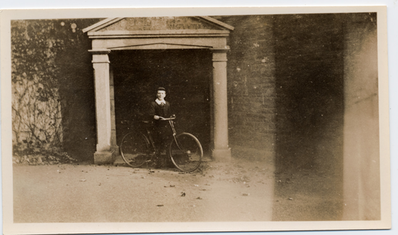 Description: Edward Branwell, standing with his bike under a stone archway in the grounds of Trevean house, Alverton. This was the home of Alfred and Isabel Branwell before moving to Penlee House in 1926. Edward and Sybil Branwell were born at Trevean and Edward died here in 1915. Printed on Velox photographic paper.