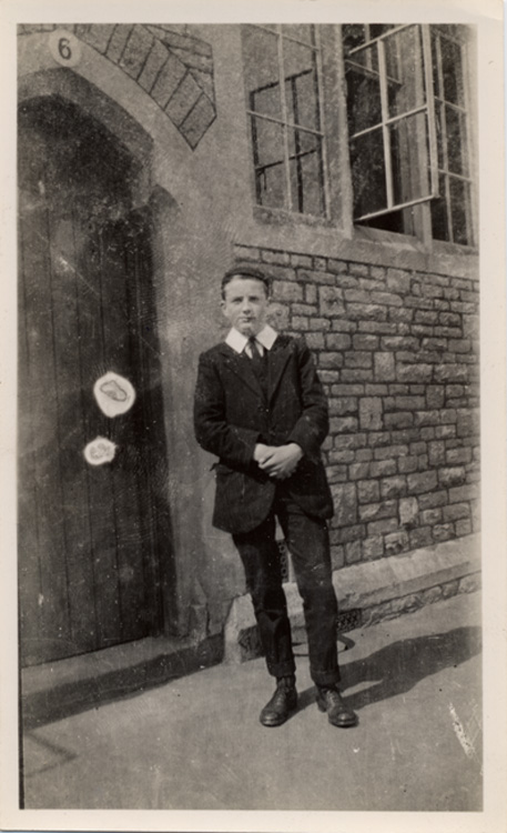 Description: Photograph of Edward Branwell standing outside Clifton College, Bristol in his school uniform. Grandson of JR Branwell, who lived at Penlee House. Printed on Velox photographic paper.