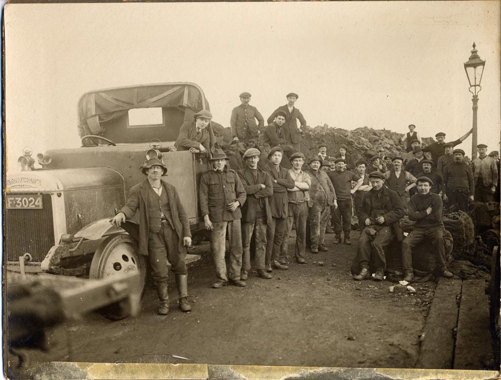 Description: A group workers facing the camera with what looks like either a new or reconditioned Thornycroft (vehicle) probably 'J' or 'K' type possibly ex WD, issued to J.H. Bennetts, trade, of Market Jew Street in 1919/20. Thornycroft of Basingstoke and Southampton, moved into the production of i.c. engined vehicles in 1907. 'J' & 'K' types were made from 1913 and about 500 'J's were built during WW1. The 'J' was of 4 ton capacity. The vehicle shown looks to be long wheelbase. The material to be shifted looks as if it is coal and maybe for local mine steam engines rather than domestic use. Sources: Wikipedia; Hampshireculturaltrust.org.uk; Registration records compiled by Margaret Perry.