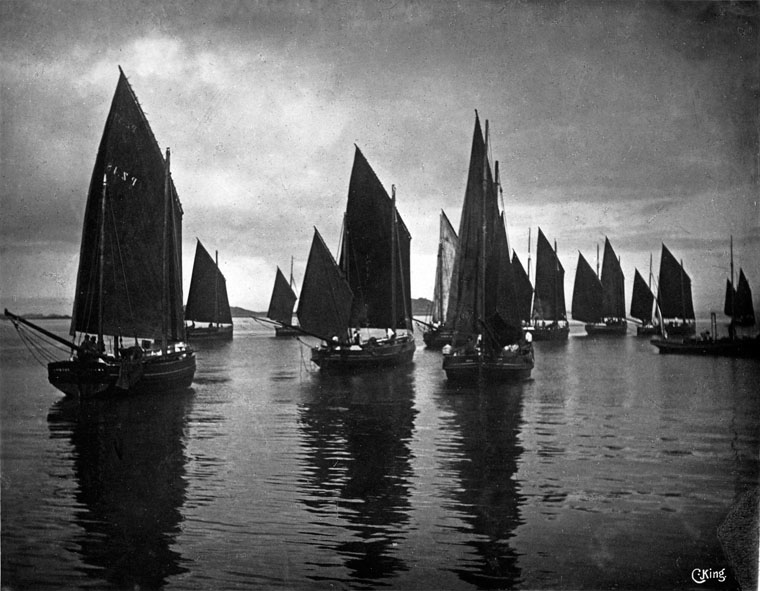 Description: Photograph showing a collection of luggers near the Isles of Scilly. One has the Penzance code on its sail. The steam launch left is probably Dorrien Smith's, the boat on the right is PZ48 Mizpah 45.6 ft, 18 tons, owned by R.Kitto & son, Penzance, skipper Edward Richards 1901-07, then sold to Shoreham. Above PZ48 on the sail is PZ39, which suggests the sail was second hand, as the PZ39 was the 42ft Hope, built in 1869 or before, broken up for firewood in 1898. She was originally PE registered.