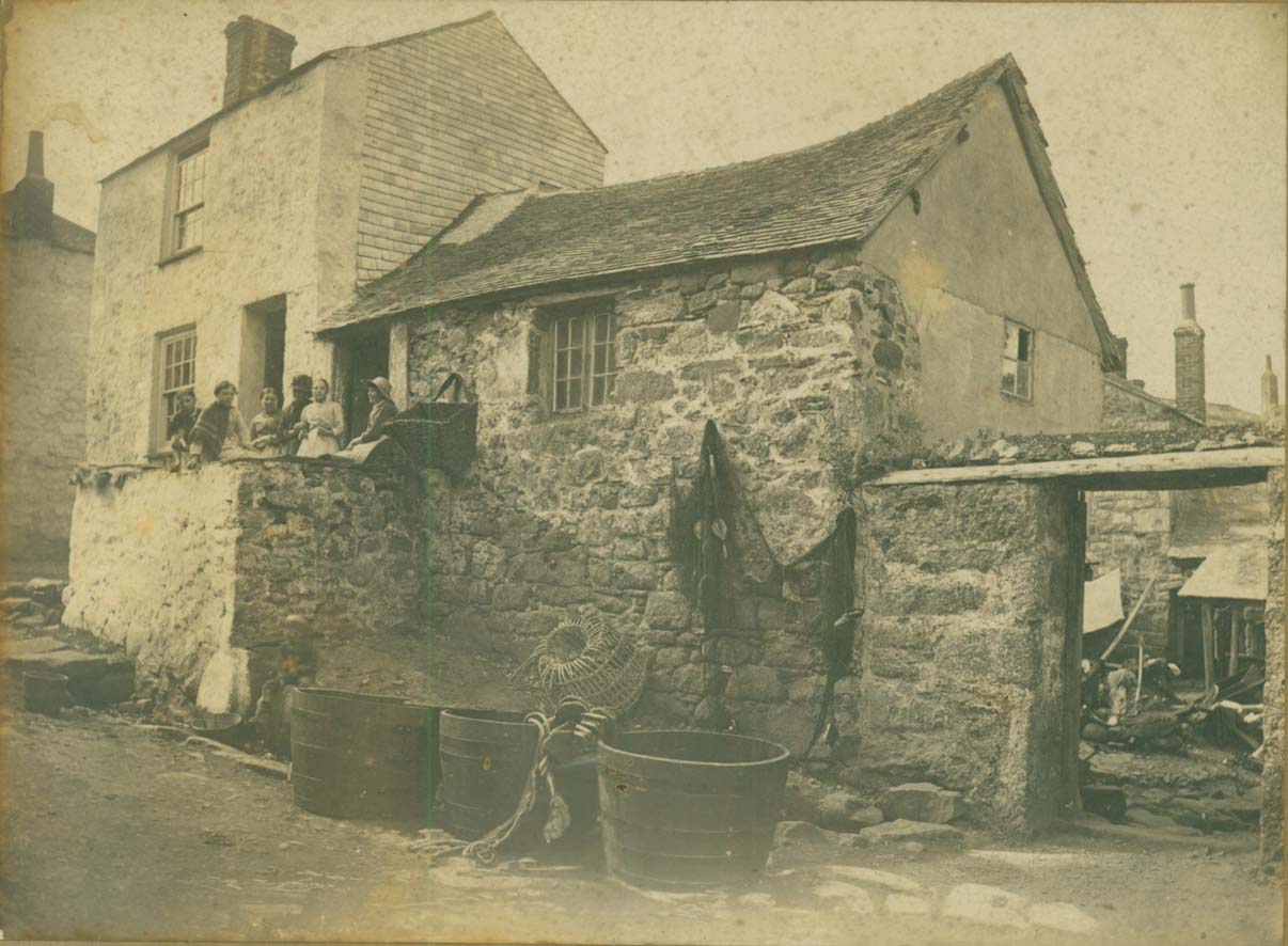 Description: Six ladies look at the camera which is taking in the scene - one house, maybe two, with fish cellars beneath. A withy pot, large stones with hooks for pilchard pressing and tubs for washing the fish lie in the street; drift nets hang on the wall; an arch leads into a pilchard cellar in an untidy courtyard with washing hanging on the wall.
