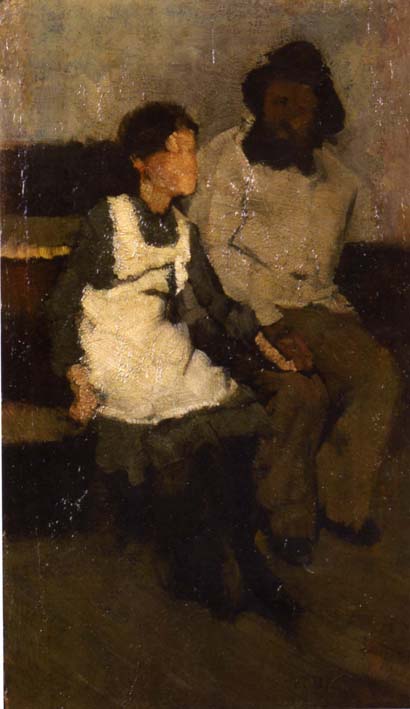 Description: Aka The Old Sailor and his Daughter. An old man and a young girl in a white apron are sitting on a bench. Though to be a study for Bramley's 1885 Royal academy exhibit 'Every One his Own Yarn'.