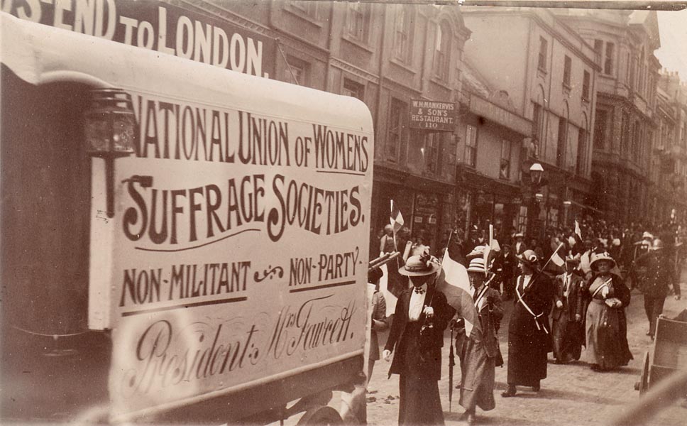 Description: This sepia postcard shows the band of Suffragettes who had started out from Lands End on 19 June 1913 as one contingent from many all over the country who were to merge as one body of 66,000 women for a rally in Hyde Park. About 200 local women joined the march at Trereife crossroads but they were not allowed to march down Market Jew Street because it was Market Day. They marched up North Street and held a rally outside the cattle market which began in a dignified manner, the audience listening to the speaker, until someone decided to move the platform and the event turned into chaos. Therefore, it is likely that this picture was taken on the following day as the contingent made its way out of town. The shadow from the sun suggests a morning event. The way the 5 pennants are blowing would suggest an east head wind. The special carriage travelled with them all the way, the women largely travelling by horse drawn transport. The policeman riding behind is wearing a brass helmet. At 110 Market Jew Street can be seen the restaurant of W H Nankevis & Sons.
