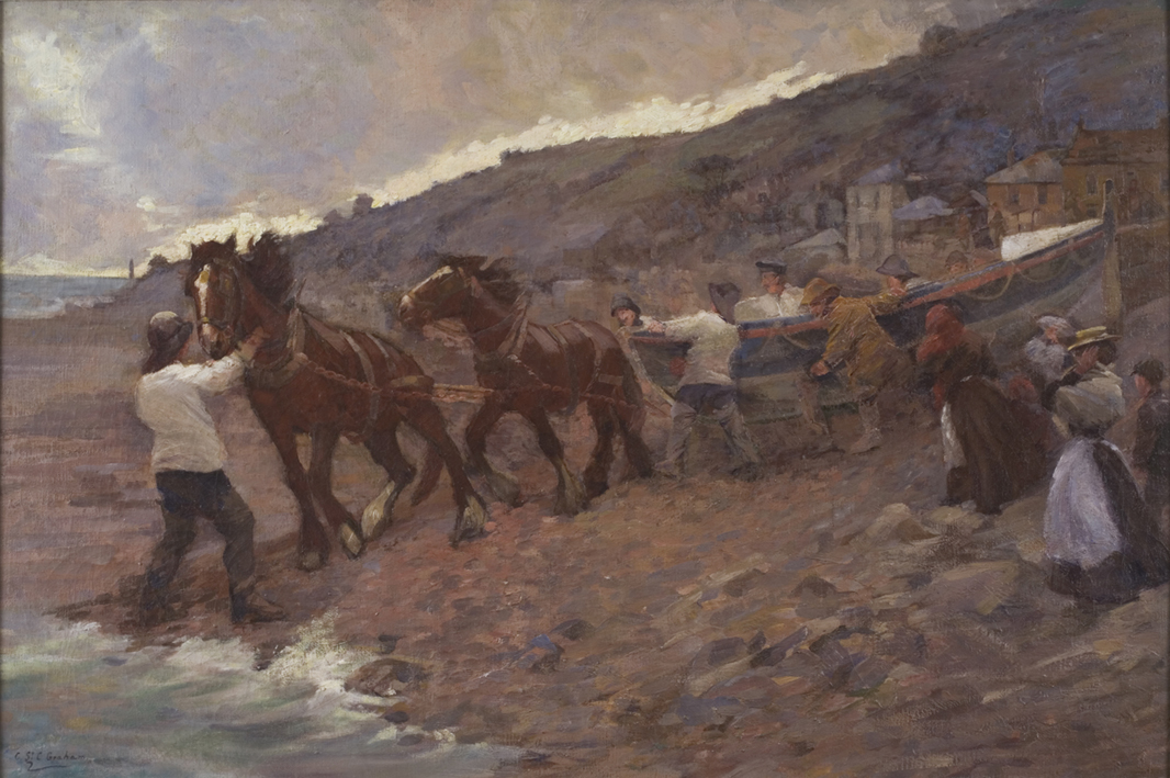 Description: Scene at Newlyn showing the lifeboat being launched with the help of two shire horses. Title is 'Launching the Lifeboat, Penzance' but it is actually Newlyn. It is possible that the lifeboat could be the 'Elizabeth and Blanche'.