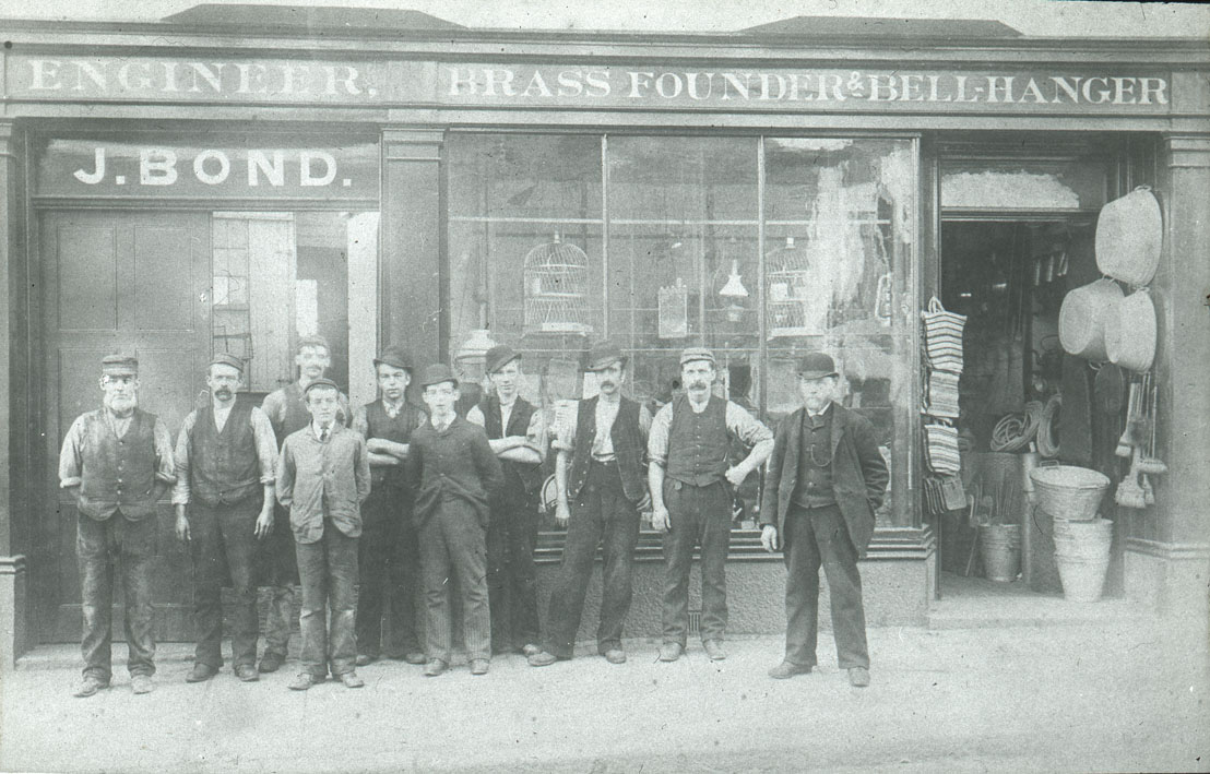 Description: This is the shop of John Bond, Engineer, Brass founder and Bell Hanger, which stood at 100 Market Jew Street, in 2011 the site of Boots the Chemist. It was founded sometime between 1864, when the premises were occupied by George Izzard, Cabinet Maker,and 1871 when Bond employed four men and three boys. In 1881 it employed six men and six boys. In 1881 the family consisted of John Bond aged 47 years; wife Elizabeth 43 years; daughter Christine 16 years; Mary J 7 years and John Junior aged 6 months who died by 1891. The Kelly Directory states : Engineer, Machinist; Ironmonger; Electrical and ordinary; Bell Hanger; Hot Water Engineer and General Smith. Rabbit nets and a bird cage can be seen in the window with flaskets, distemper brushes, linen baskets and buckets in the doorway.