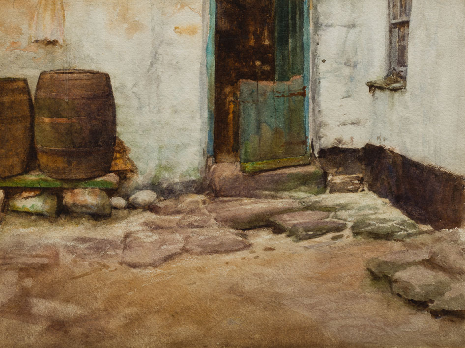 Description: Courtyard with 2 wooden barrels on left and open farmhouse door, centre right.