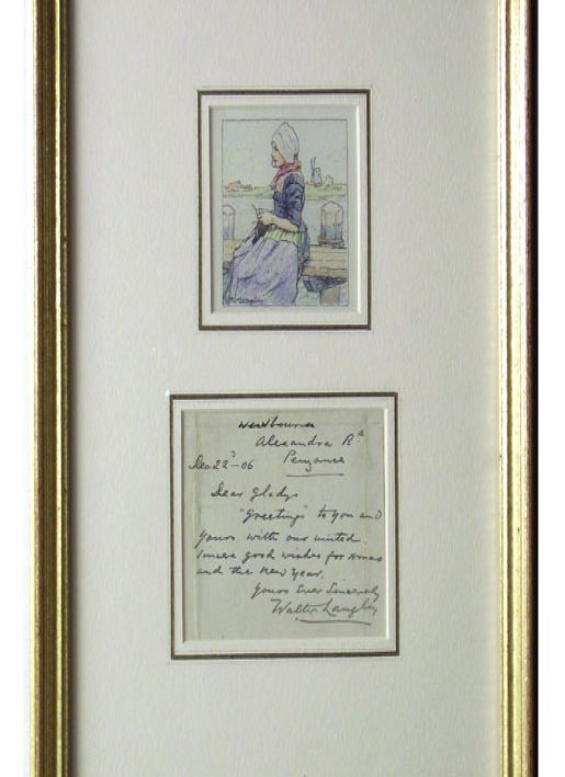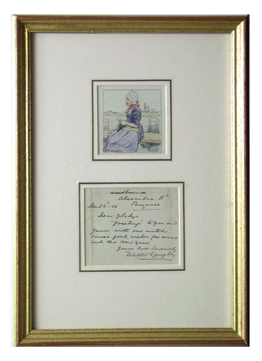 Description: Framed Christmas card with a small image with Dutch girl sitting on wooden fence knitting with water, cottage and windmill behind and greetings note in Langley's own hand.