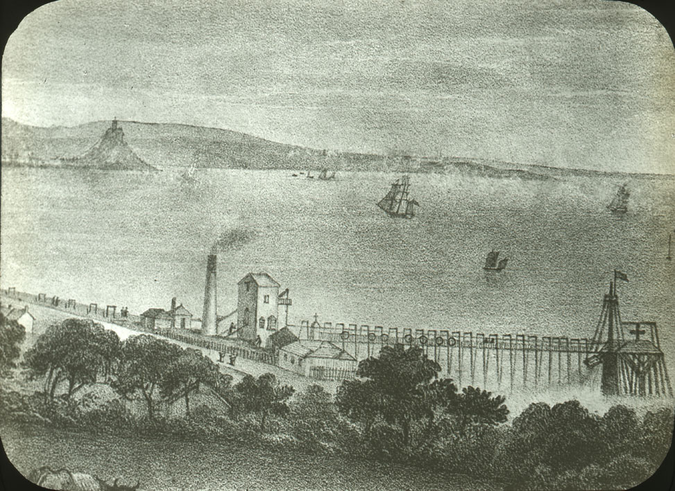 Description: This is a slide of an engraving of Wherry Town Mine shaft situated out to sea between Penzance exposed during a very low tide . Built in 1778 by Thomas Curtis of Breage, the mine shaft was protected by a stone breakwater. Thomas Gundry erected a steam engine on shore to facilitate lifting the ore from the mine workings. Operations ceased in 1798 when an American vessel anchored in the bay, broke its moorings and crashed into and demolished the head gear. It re-opened in the 1830s but closed again in 1840. As the accuracy of the details cannot be known, it is impossible to date.